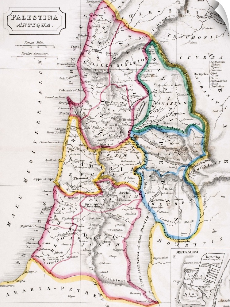 <p>KW288095 Map of Palestine, Palestina Antiqua, from 'The Atlas of Ancient Geography' by Samuel Butler, published in London, c.1829 (colour litho) by English School, (19th century); Private Collection; Ken Welsh; English, out of copyright</p>