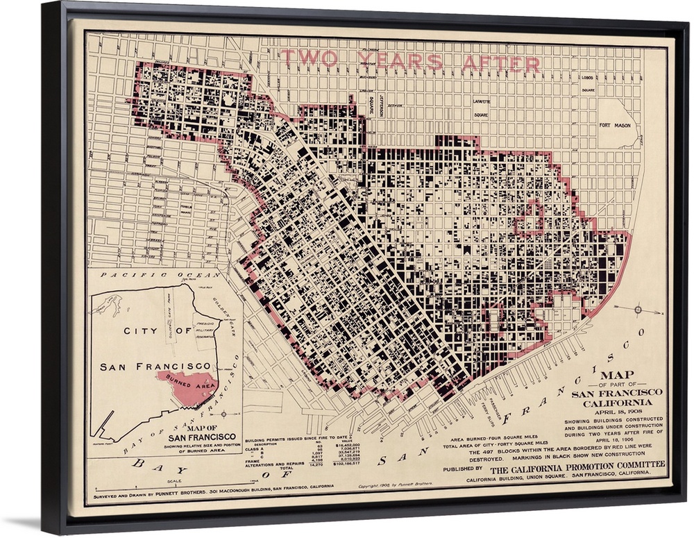 <p>Shows downtown San Francisco indicating the area that was destroyed after the earthquake and fire of 1906, and new construction as of 1908. Includes inset map of the entire city of San Francisco titled 'Map of San Francisco Showing Relative Size and Position of Burned Area'.</p>