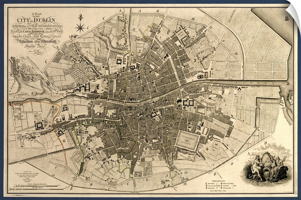 <p>Map of the City of Dublin, Ireland. Published in 1797, this map includes details of the canals being built at the time. Canal Harbour (lower right) connects across bottom with the Grand Canal (lower left). The Royal Canal (upper right and a branch at upper centre) was a competing canal. Running across centre is the River Liffey. Borders of the city's wards are marked in coloured lines, with a key at lower right, next to the city coat of arms. The scale at lower left is in both English and Irish miles. In 1797, Ireland was ruled by Britain, and this map was published by the geographer to King George III and the Prince of Wales (the future King George IV).</p>