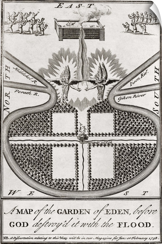 <p>Garden of Eden. 18th century diagram showing the supposed layout of the Garden of Eden. The description in the Bible tells of a garden in a region called Eden with four rivers, an east-facing entrance and the Tree of Knowledge of Good and Evil at the centre. Once Adam and Eve had been expelled from the garden for eating the fruit of the tree, the entrance was guarded by cherubim and an omni-directional flaming sword. This engraving first appeared in the Gentleman's Magazine in 1737.</p>