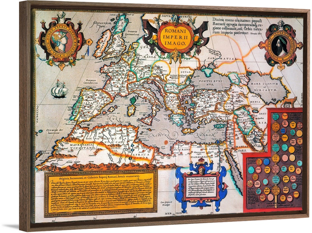 <p>Map Of the Roman Empire. From the 1595 Atlas, 'Theatrum Orbis Terrarum,' By Abraham Oertel, Also Known As Ortelius, Featuring Portraits Of Roma, Deity Of Ancient Rome, And Romulus, the City's Legendary Founder.</p>