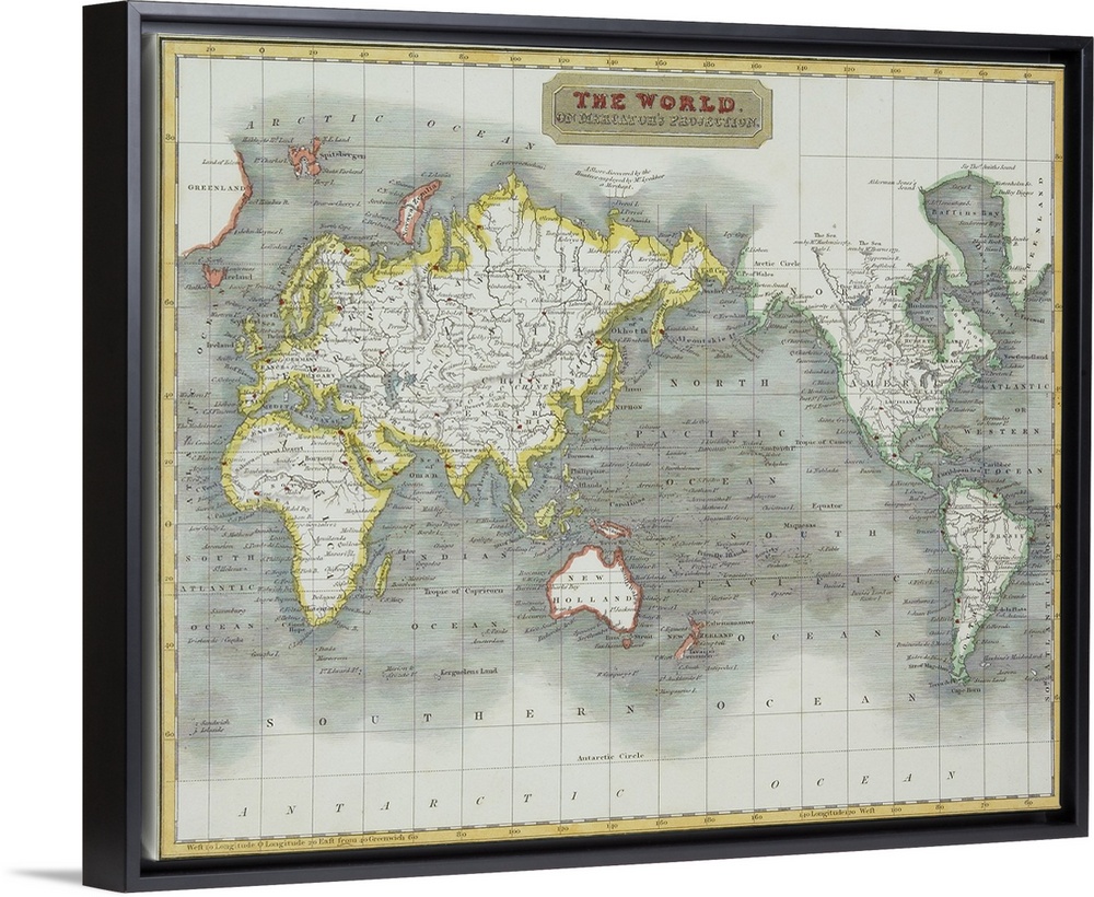 <p>Antique map of the world with the ocean levels reprensented by contrasting shades and rivers and strems highlighted in each country.</p>