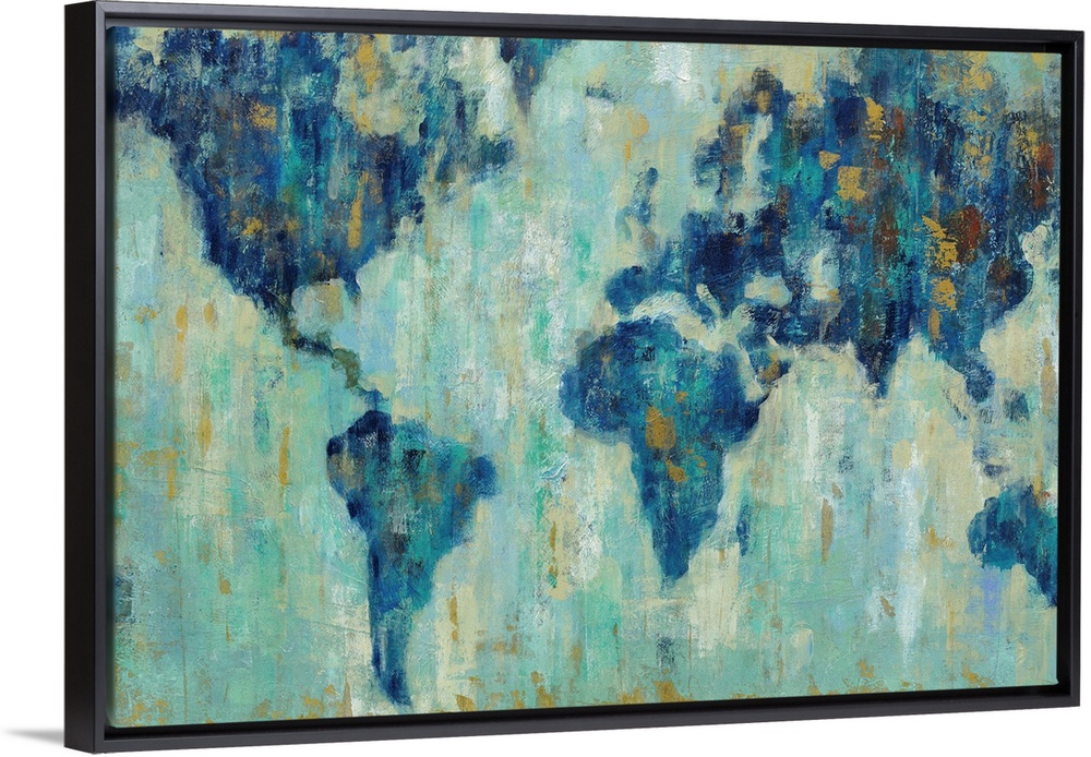<p>A contemporary painting of a world map in a blue tones against a pale teal background.</p>