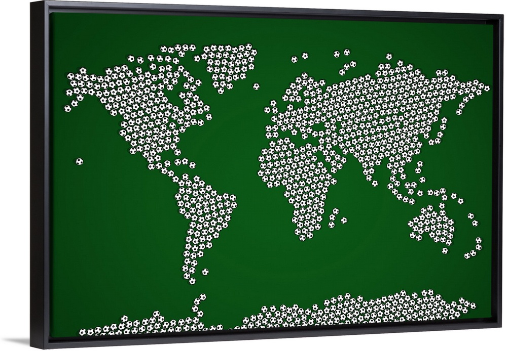 <p>Landscape, horizontal, large wall hanging of the world map with all countries made up of soccer balls, on a solid green background.</p>