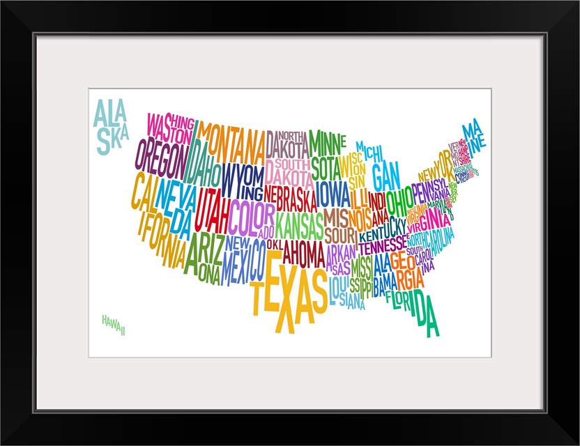 <p>Artwork of the United States that has the name of each state written out as it's shape.</p>