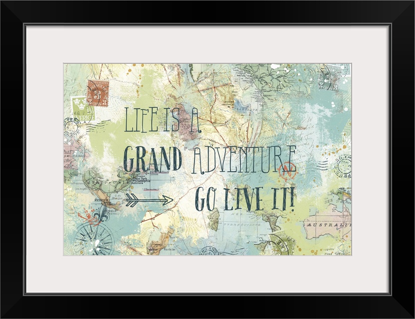 <p>"Life is a Grand Adventure, Go Live It!" written on top of a map and postage stamp collage.</p>