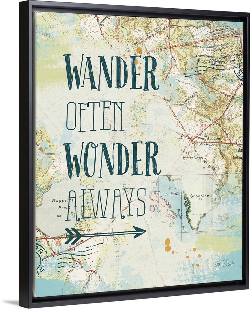 <p>"Wander Often Wonder Always" written on top of a map and postage stamp collage.</p>