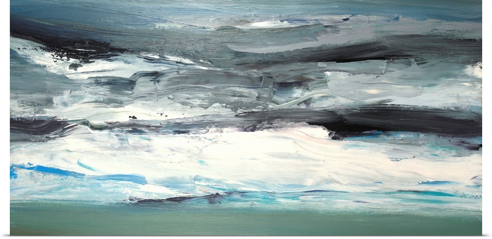 <p>Long horizontal abstract painting of textured horizontal brush strokes in white, gray and blue, giving the appearance of waves.</p>