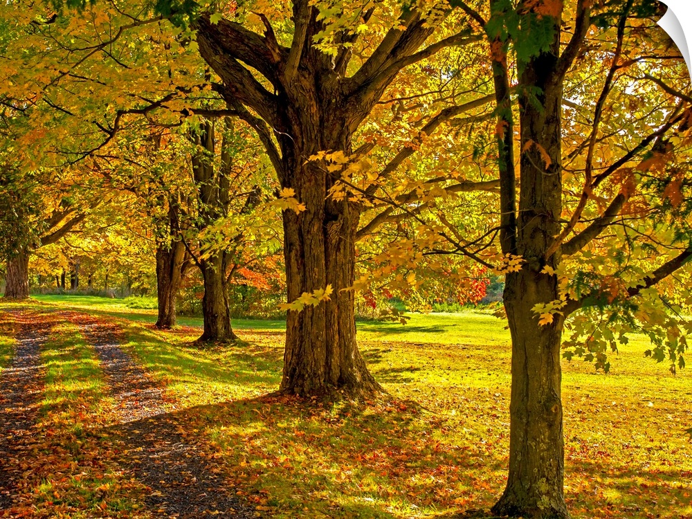 <p>Maple trees line a driveway in autumn, Fulford, Quebec, Canada.</p>