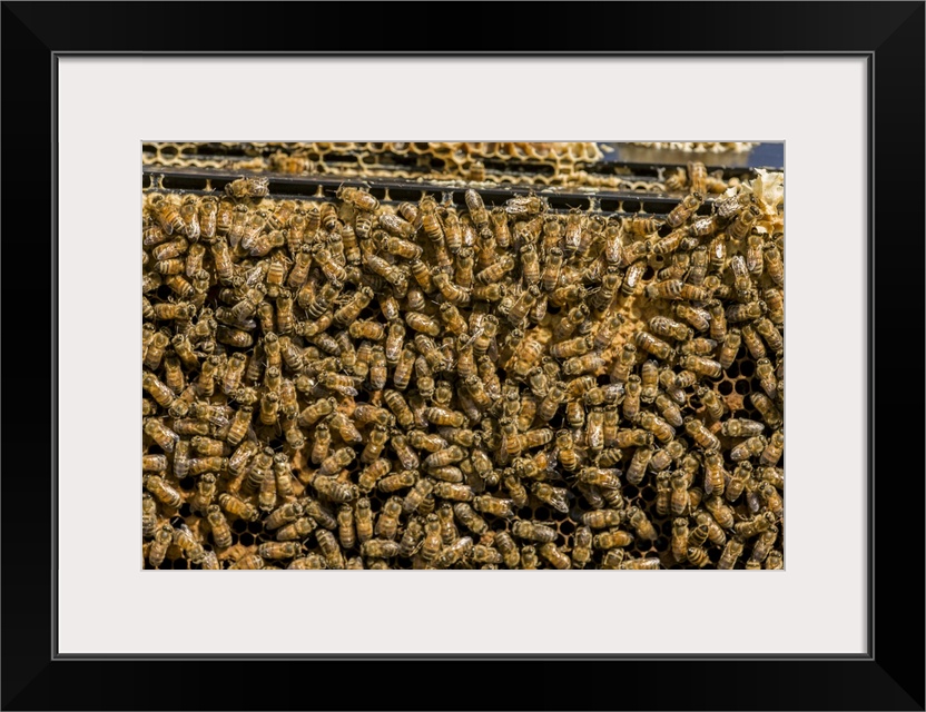 <p>Maple Valley, Washington State, USA. Frames full of worker bees storing honey and tending the nursery.</p>