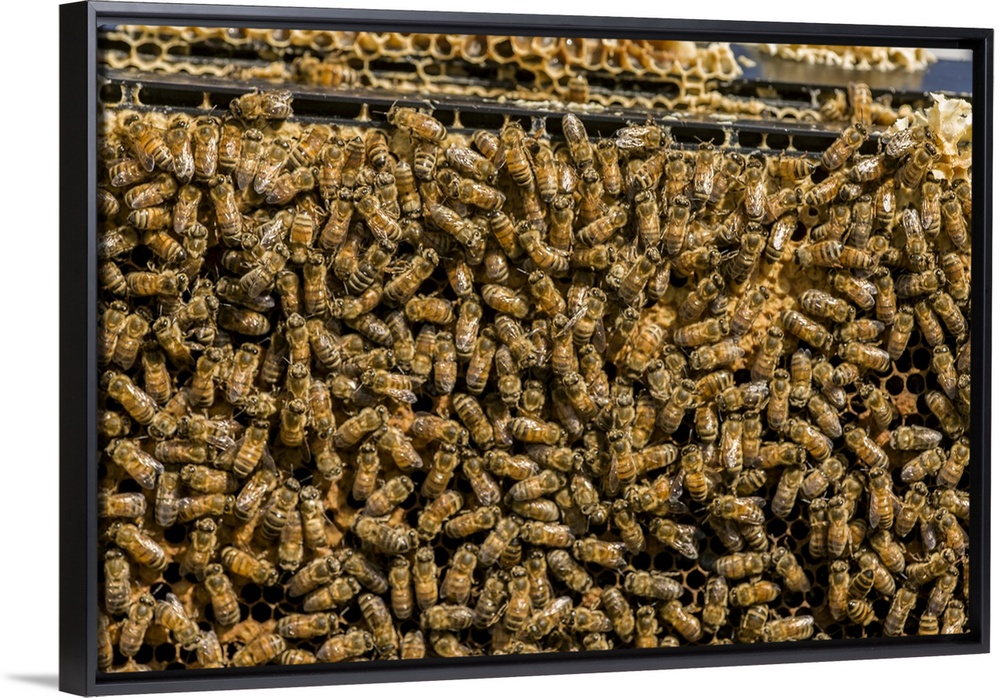 <p>Maple Valley, Washington State, USA. Frames full of worker bees storing honey and tending the nursery.</p>