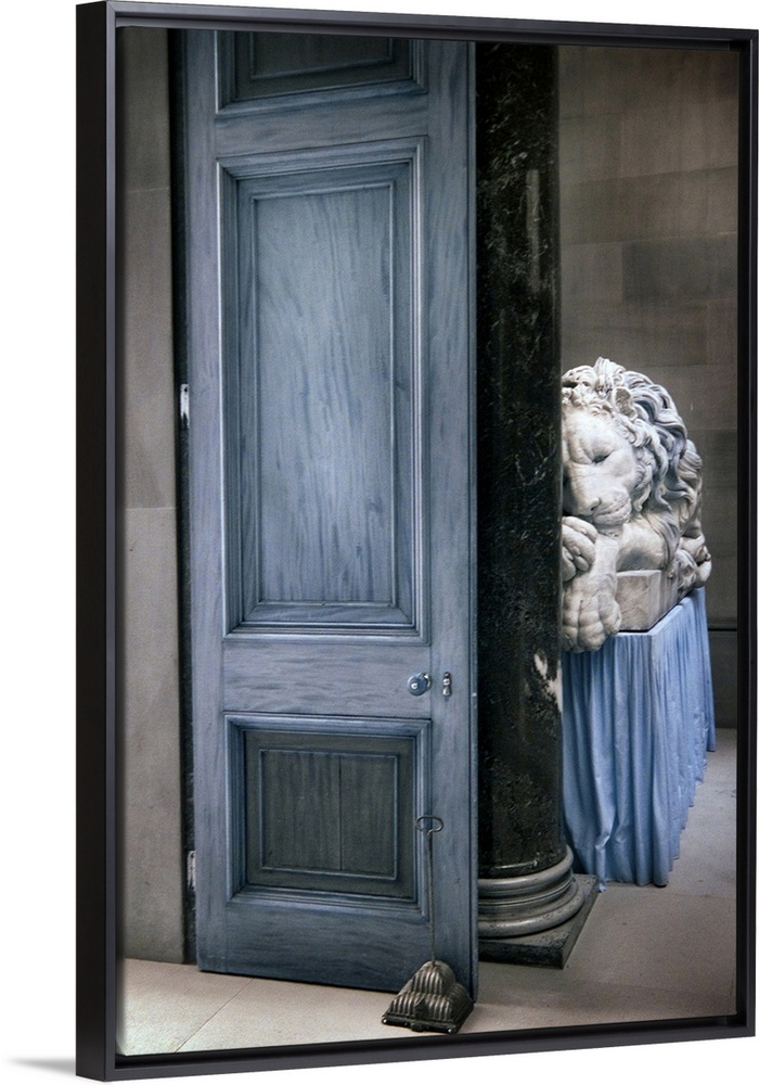 <p>A large door and a carved marble lion</p>