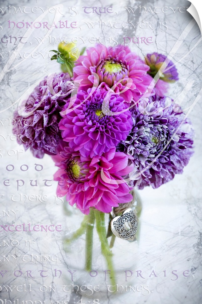 <p>Marbled purple dahlia's arranged in a glass jar with Philippians 4:8 written in the background, and the word 'lovely' written over the flowers</p>