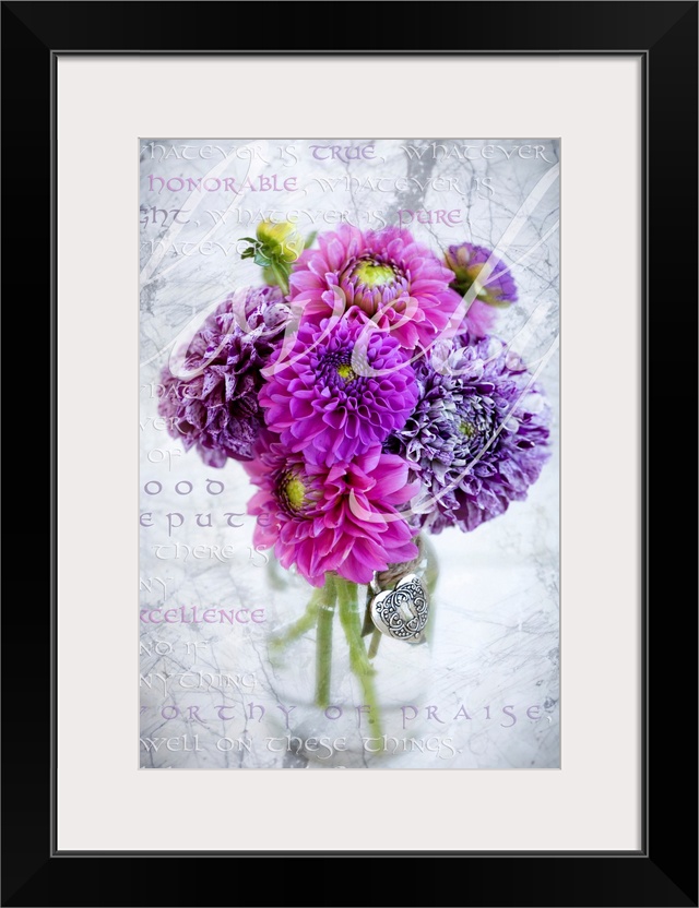 <p>Marbled purple dahlia's arranged in a glass jar with Philippians 4:8 written in the background, and the word 'lovely' written over the flowers</p>