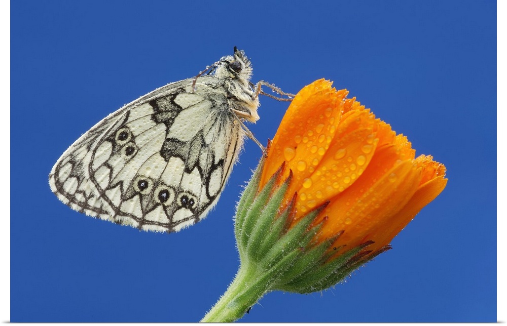 <p>Marbled White (Melanargia galathea) perched on orange flower in Bavaria, Germany</p>