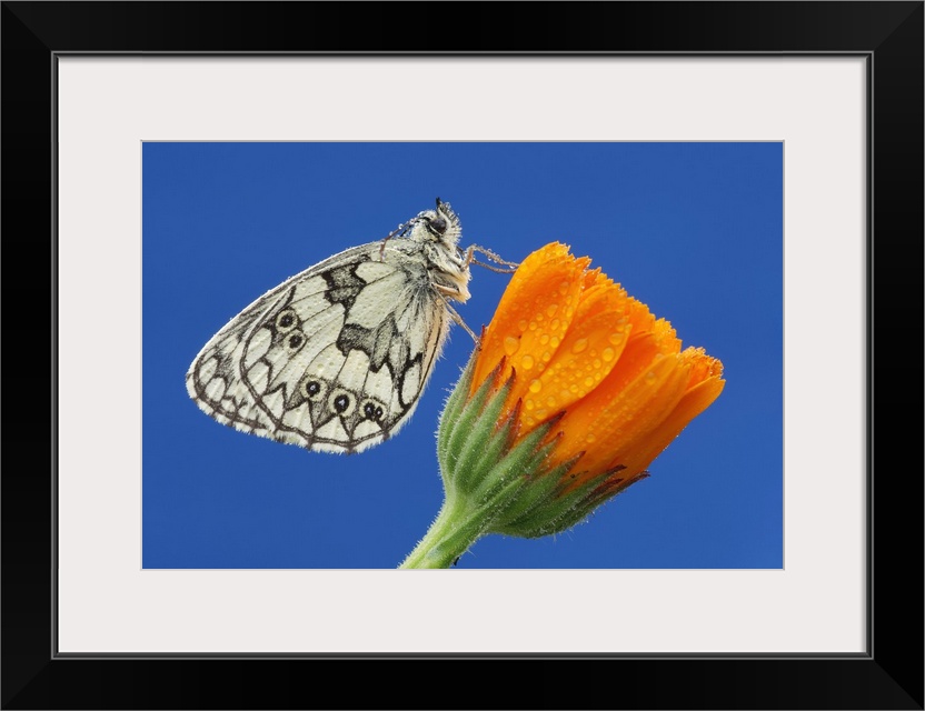 <p>Marbled White (Melanargia galathea) perched on orange flower in Bavaria, Germany</p>