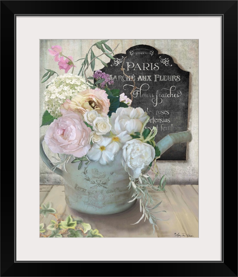 <p>A bouquet of roses and peonies in an old watering can next to a chalkboard sign.</p>
