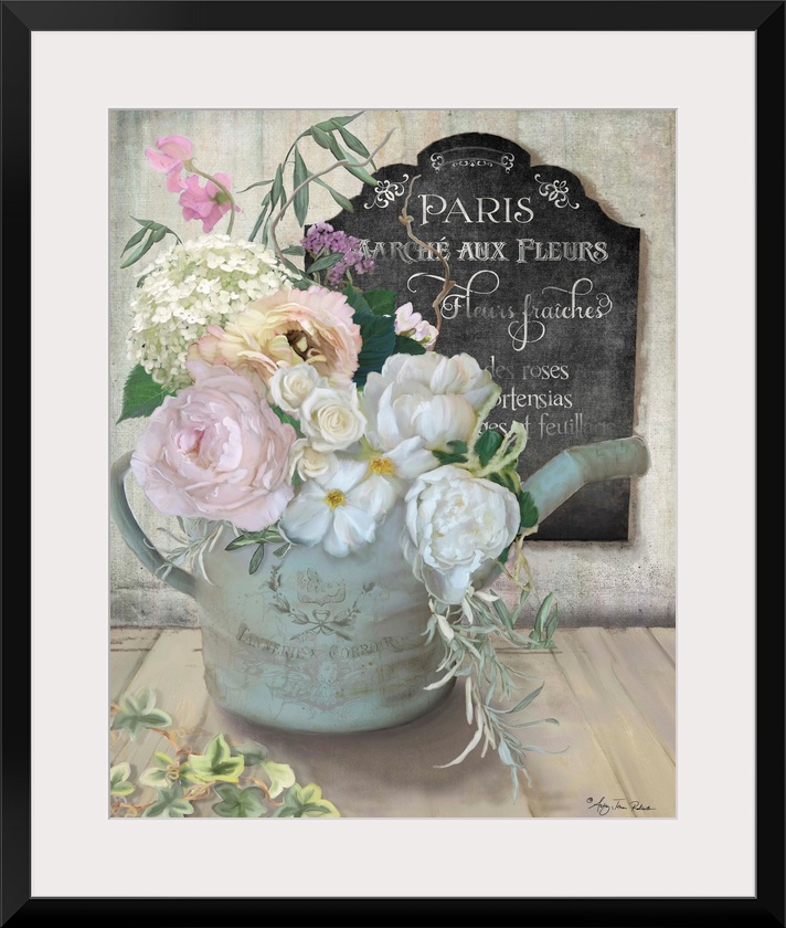 <p>A bouquet of roses and peonies in an old watering can next to a chalkboard sign.</p>