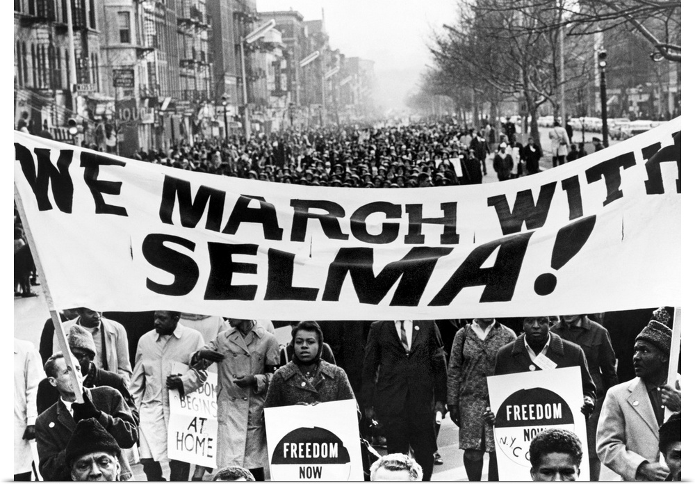 <p>Marchers in Harlem, New York City, carrying banners in support of the Selma to Montgomery marchers. Photograph by Stanley Wolfson,1965</p>