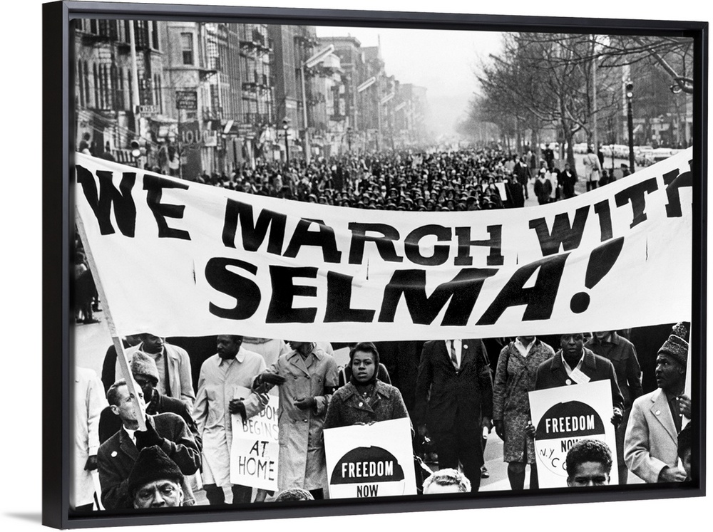 <p>Marchers in Harlem, New York City, carrying banners in support of the Selma to Montgomery marchers. Photograph by Stanley Wolfson,1965</p>
