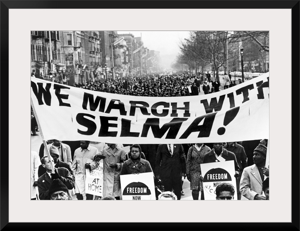 <p>Marchers in Harlem, New York City, carrying banners in support of the Selma to Montgomery marchers. Photograph by Stanley Wolfson,1965</p>