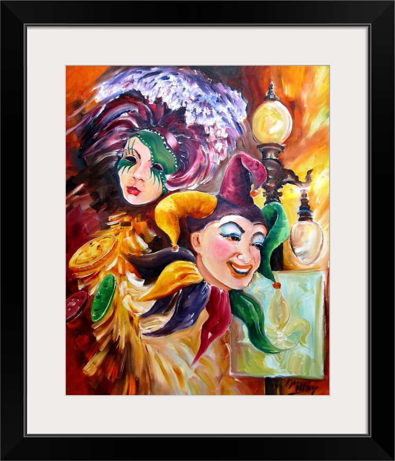 <p>Large painting on canvas of a jester with a mask and big lamp post behind him.</p>