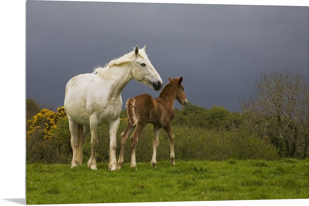 <p>Photograph of two horses in meadow with trees and shrubbery in distance under a foggy sky.</p>