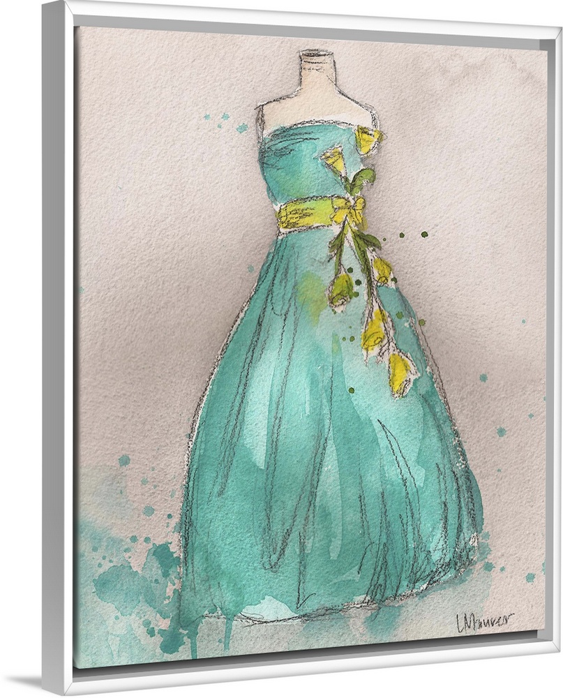 <p>Watercolor painting of a green dress on a dress form.</p>