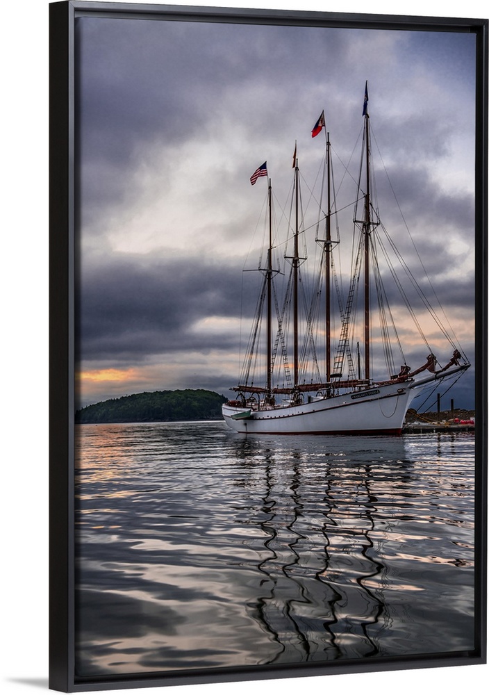 <p>Beautiful sailing ship Margaret Todd rests at it's pier amidst a dramatic atmospheric sunrise in Bar Harbor Maine.</p>