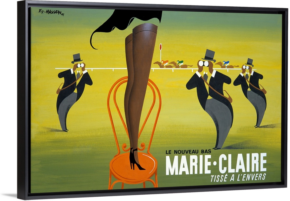 <p>Antique advertising poster with lady standing on a chair with only her legs visible. There are men in the background with binoculars looking her way and a derby race is taking place in the distance.</p>