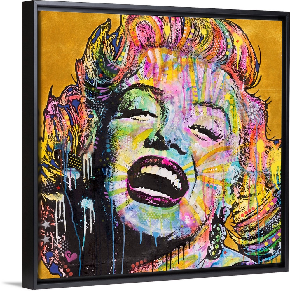 <p>Square illustration of Marilyn Monroe laughing and full of color with paint drips running down to the bottom on a gold background.</p>