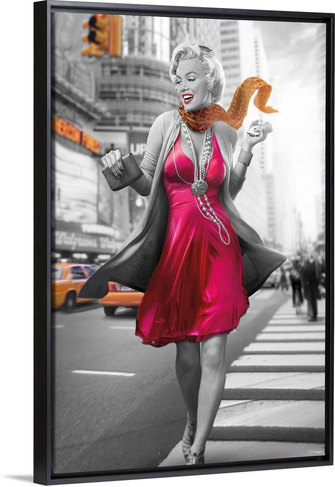 <p>Digital art painting of Marilyn Monroe, in black and white with splashes of orange and fuchsia, strolling down the avenue in New York City by JJ Brando.</p>