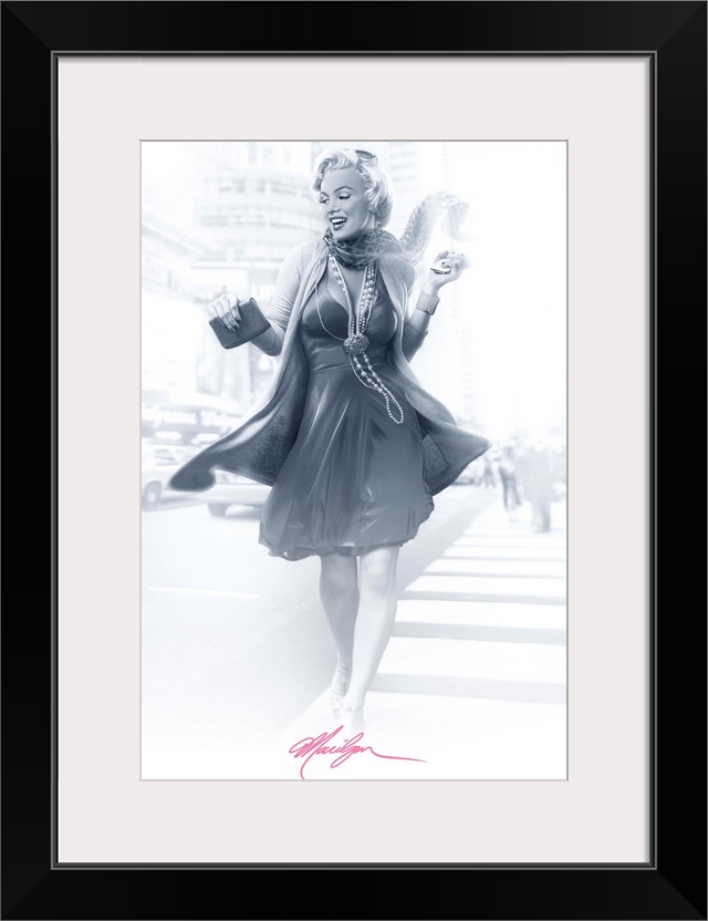 <p>Marilyn Monroe walking down a city street in black and white.</p>