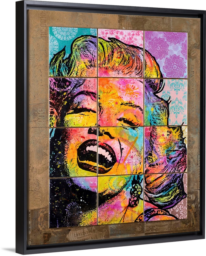 <p>12 colorful tiles placed together to create Marilyn Monroe's face on top of a brown background with faded money illustrations.</p>