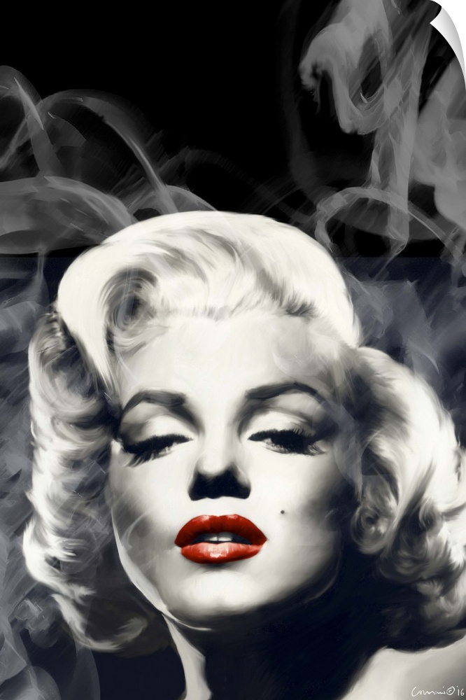 <p>Portrait of actress Marilyn Monroe with red lips and wisps of smoke.</p>