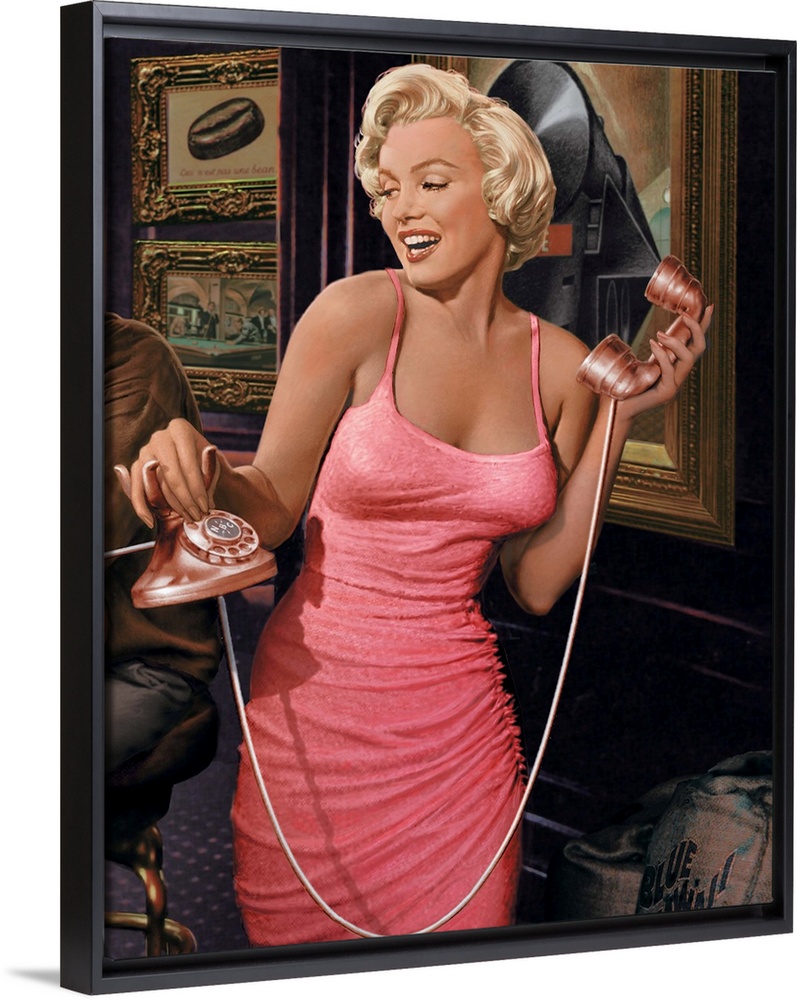 <p>Portrait of Marilyn Monroe in a pink dress holding a classic telephone in a bar setting.</p>
