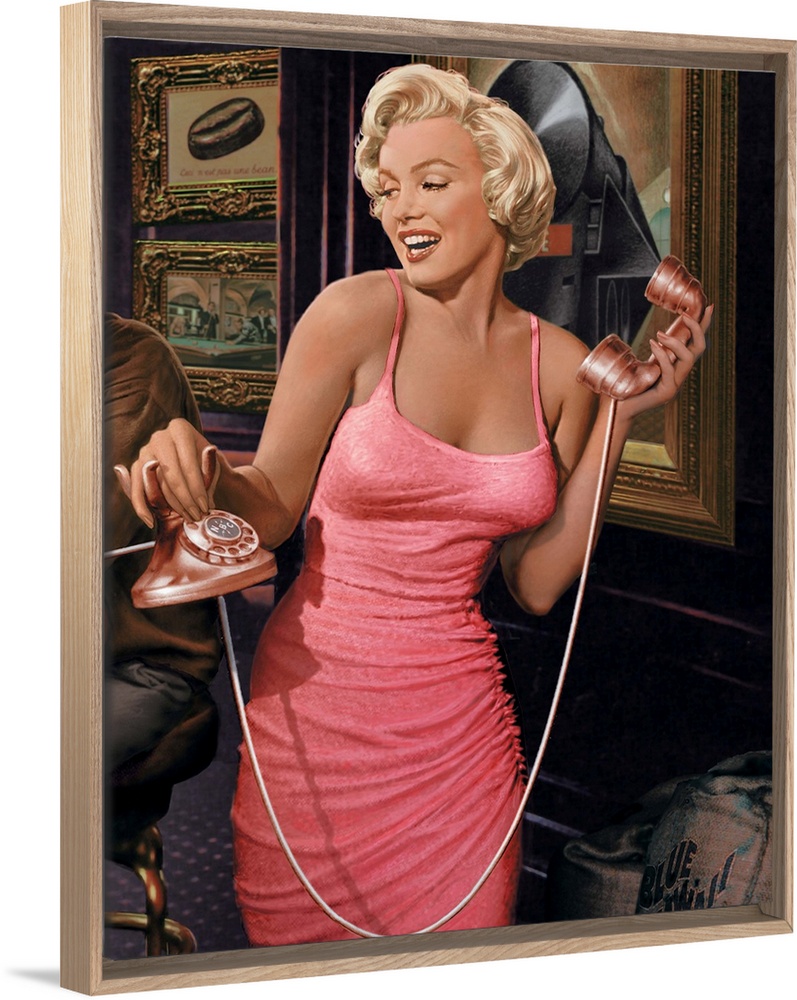 <p>Portrait of Marilyn Monroe in a pink dress holding a classic telephone in a bar setting.</p>