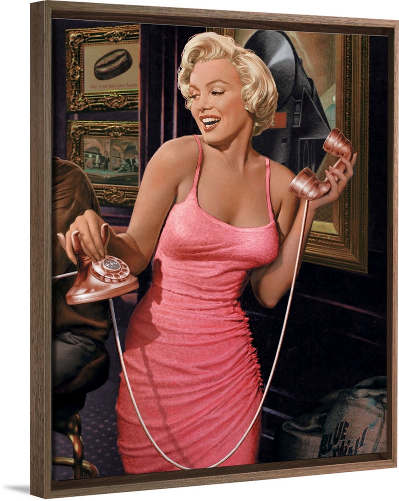 <p>Portrait of Marilyn Monroe in a pink dress holding a classic telephone in a bar setting.</p>
