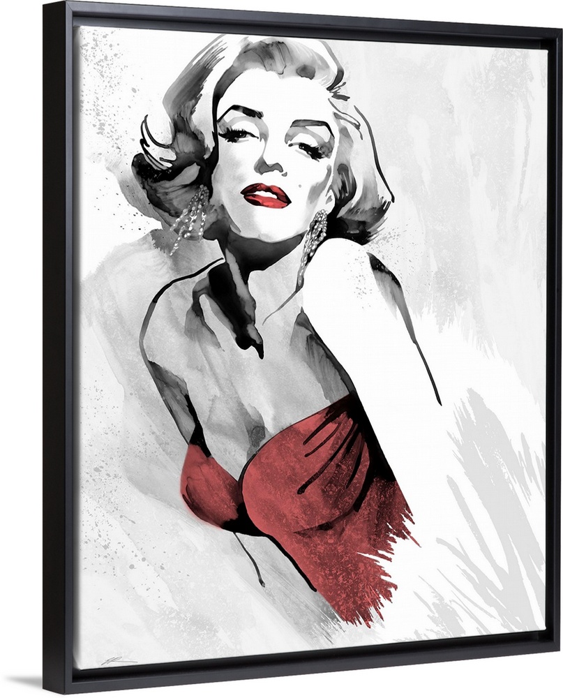 <p>Marilyn Monroe's fashion pose in black and white with red lips and a red retro 1980's strapless dress.</p>