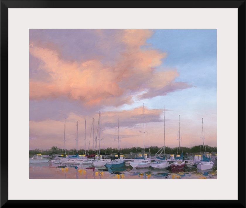 <p>Contemporary painting of boats in a harbor in low light at sunset.</p>