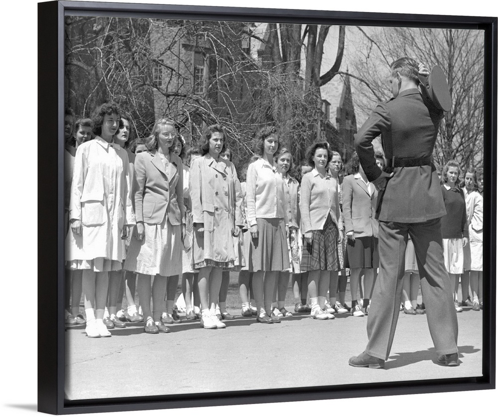 <p>Drill Instructor looks over new arrivals to Marine Corps Women's Reserve Officer's Candidate School. Ca.1945.</p>