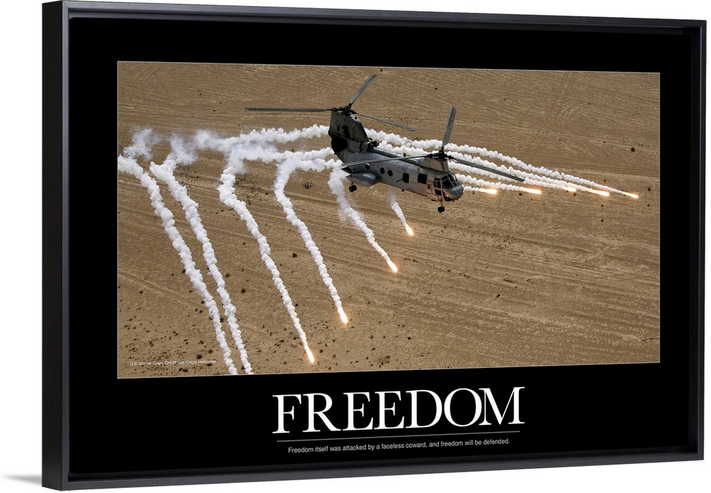 <p>A military helicopter is pictured as it shoots numerous flares above the desert. The word freedom and a quote are written below it.</p>