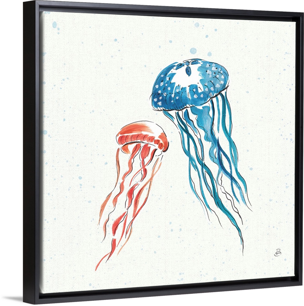 <p>Coral and blue jellyfish on a white square background with light blue paint splatter.</p>