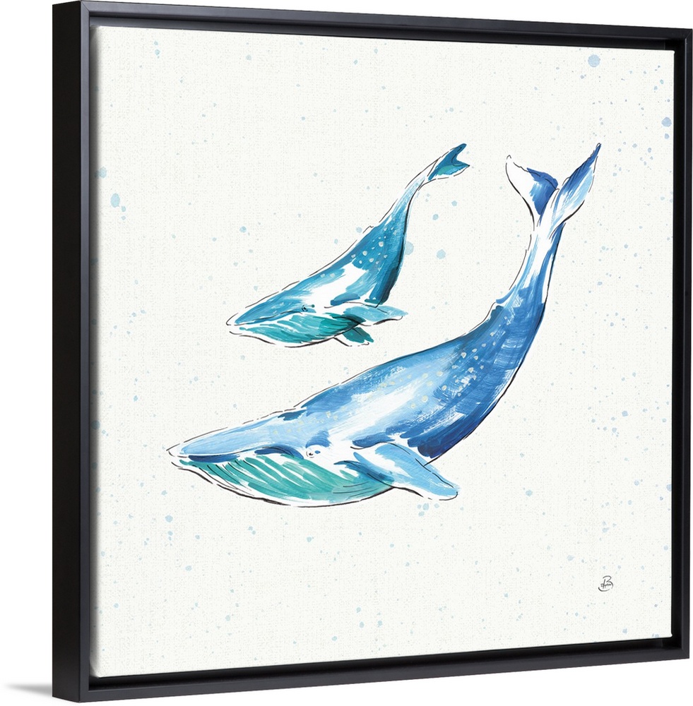 <p>Two blue whales swimming on a white square background with light blue paint splatter.</p>