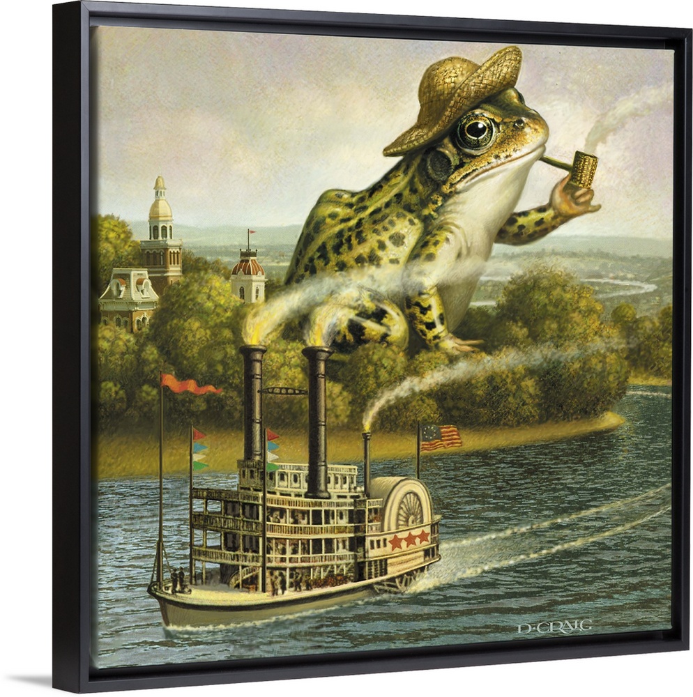 <p>Giant frog smoking a pipe near a river with steamboat.</p>