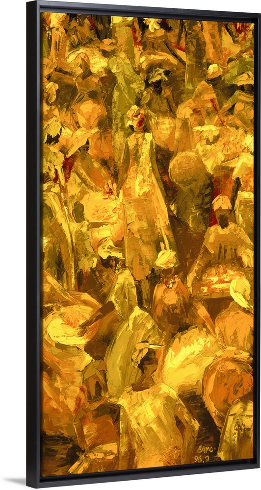 <p>Contemporary African American painting of a crowd of people in a busy marketplace, done in golden tones.</p>