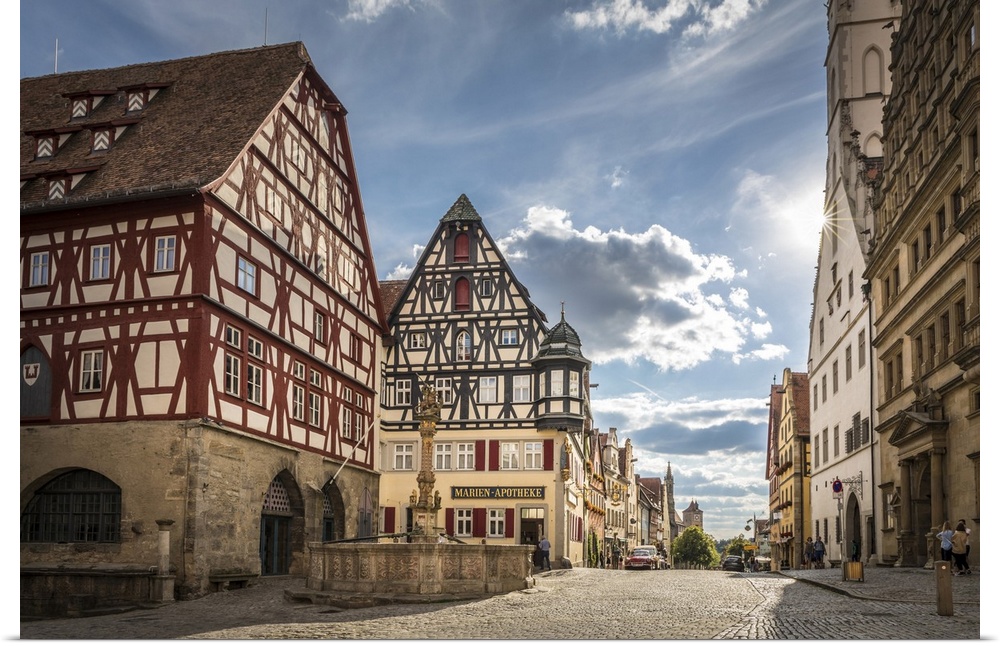 <p>Market Square fountain and historic houses in Herrngasse in the old town of Rothenburg ob der Tauber, Middle Franconia, Bavaria, Germany</p>