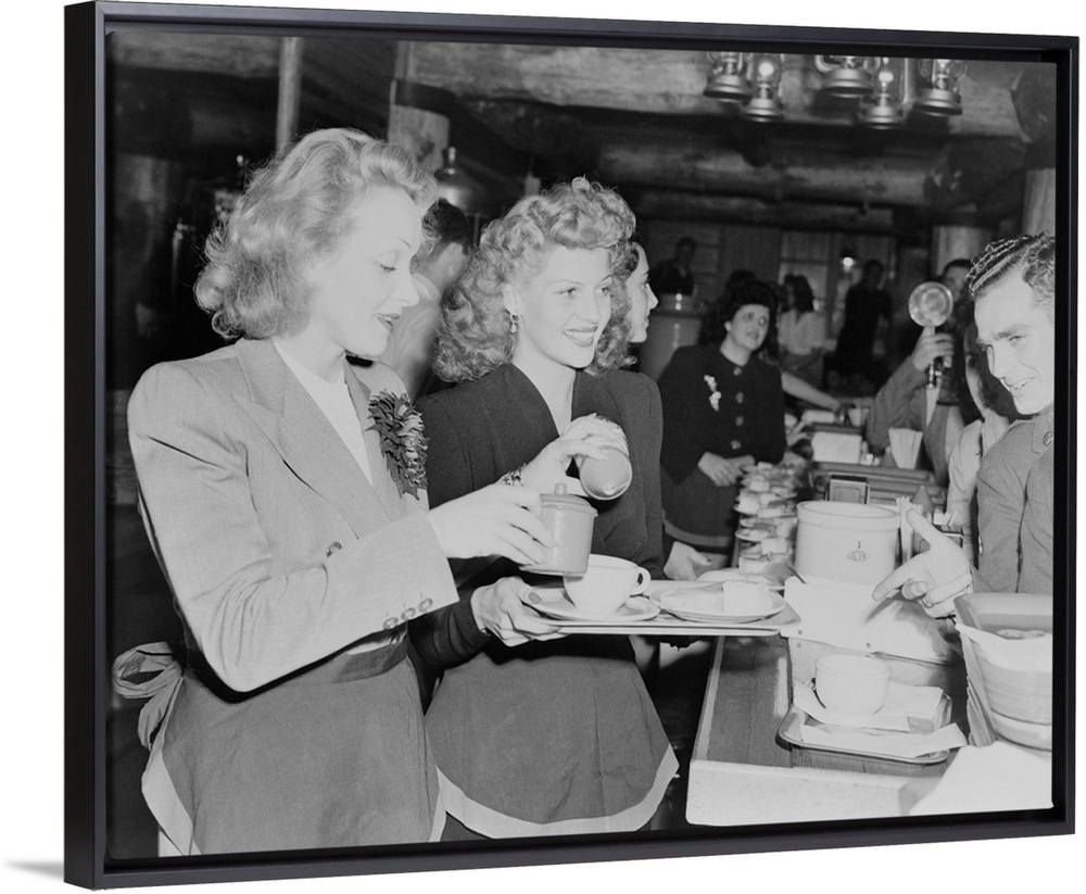 <p>Marlene Dietrich and Rita Hayworth serve soldiers at the Hollywood Canteen during World War II. Nov. 17, 1942.</p>