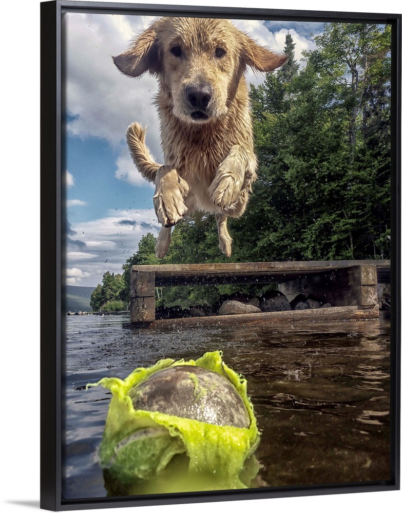 <p>A retriever jumping into a lake after a chewed up tennis ball.</p>