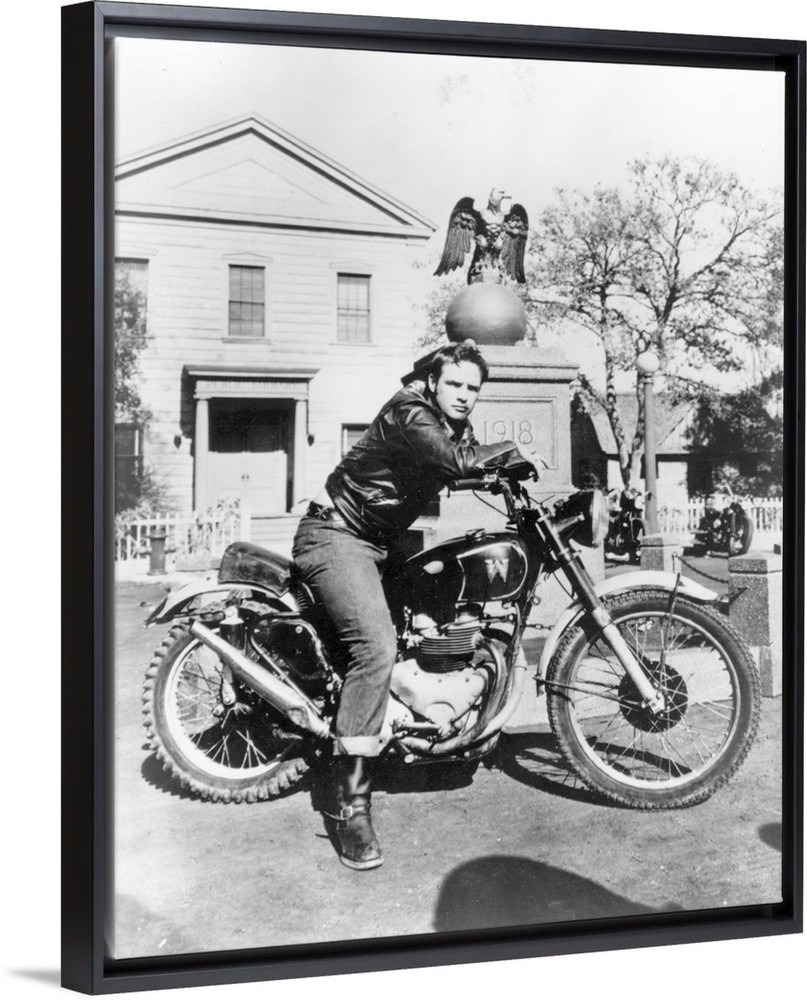 <p>Burly American actor Marlon Brando sitting astride his motorbike in a scene from the classic film 'The Wild One', directed by Laslo Benedek for Columbia</p>